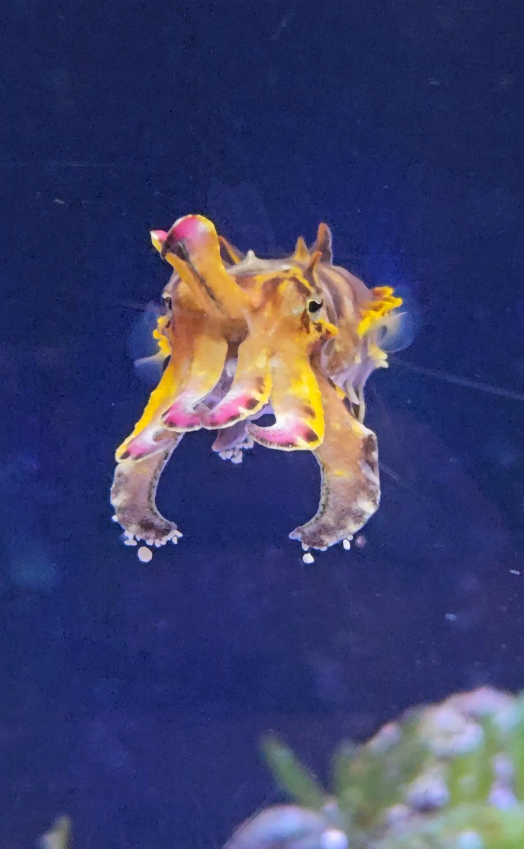 Third, They only are three inches long and yes, can change color like other cuttlefish. Usually, it appears that they are bright purple and yellow with bumps that make it appear more threatening.