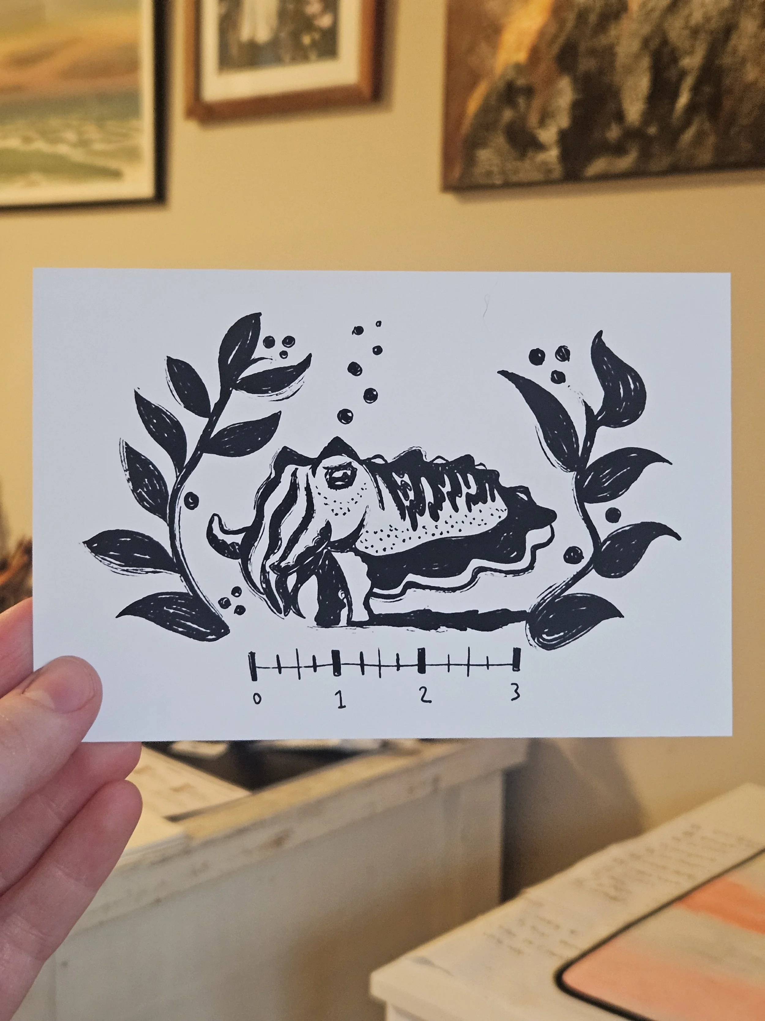 Admittedly, this month I created the print digitally, with the goal of recreating the look of a physical printed block. This did disappoint my art-making spirit, as digital art has been hit or miss for a creatively fulfilling project. That being said, I am satisfied with the illustration of the flamboyant cuddlefish! I debated adding color in because these beauties are extremely vibrant, but decided to stick with the minimal black-and-white scheme.